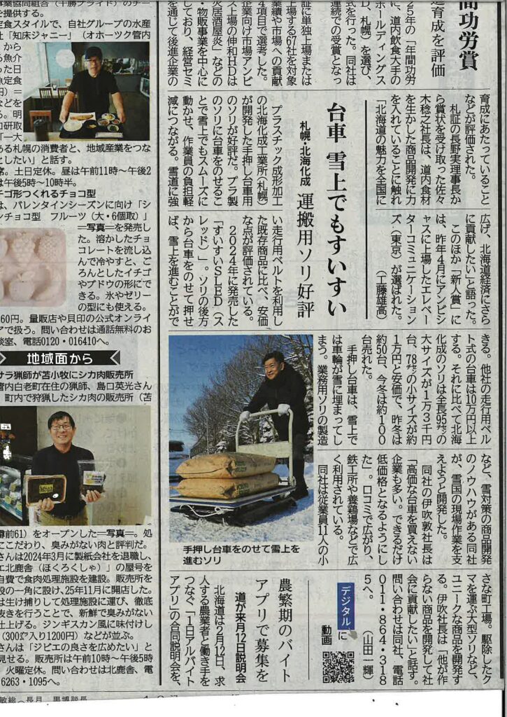 【メディア掲載】道新で紹介!雪道でも台車がハマらない、画期的な「運搬ソリ」